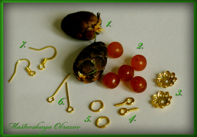 2. Янтарные бусинки (ну или любые, какие вам вздумается :) 3. Шляпки для бусин (можно купить в специальных магазинах фурнитуры, а вскоре и у нас в Мастерской) 4. Штифты (винтики с ушками) 5. Колечки двойной крутки (ну можно и самим из проволоки скрутить, или купить через интернет) 6. Пины с ушками 7. Швензы для сережек (тоже, кстати, легко сделать самим из проволоки).